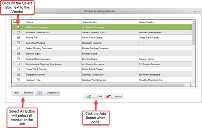 6) From the Vendor Selection Screen Dialog Box, click on the Select Box next to the desired Vendor(s). If a Prime Vendor has a Tier associated with them, then the tier will automatically be selected. Users can also click on the Select All Button to include all the Vendors on the Job.