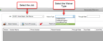 2) From the Generate Waivers Dialog Box, select the Job from the Job Pull-Down Menu. Then select the Waiver Form from the Waiver Type Drop-Down Menu.
