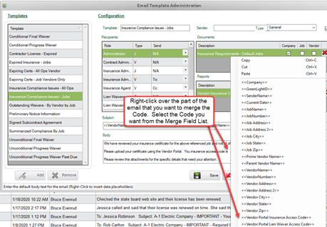 6) Select an existing Email Template or create a new one. To add the Code(s), right-click the mouse of the part of the email you want to merge the Code. Select <<Vendor Portal Insurance Code>> or <<Vendor Portal Lien Waiver Code>> from the list.