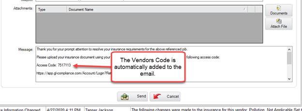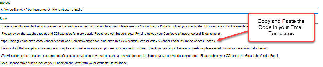 7) When the automated or manual Compliance Emails are sent to the vendors, the Portal Access Code for that vendor will now be in the body of the email, allowing them to paste the Code on the Portal Access Code login screen.