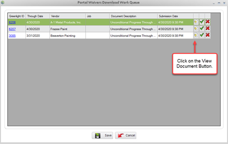 5) If the Lien Waiver document is correct and there are no issues, then click on the Green Checkmark Button. If you click on the button, the Application will accecpt the document and data. The Waiver Record will be removed from the Lien Waiver Portal Queue.