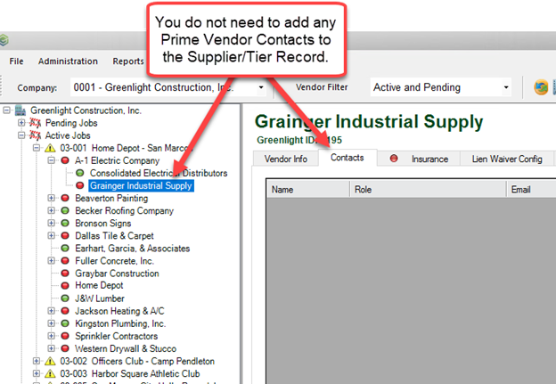 2) Add a Supplier/Tier record to Greenlight. You do not need to add any Prime Contacts to the Contacts Tab on the Supplier/Tier record. If you want to add a contact for the Supplier/Tier that is not related to the Prime Vendor, then you can still add that contact.
